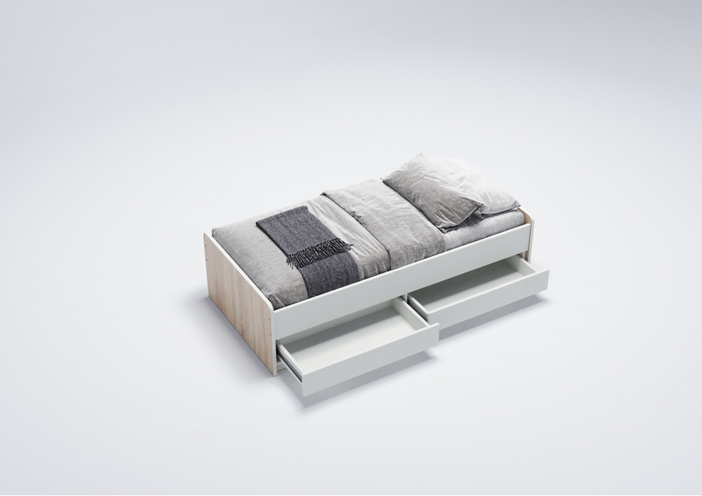 3.    Практичные ящики: Кровать оснащена двумя выдвижными вместительными ящиками, которые оборудованы телескопическими направляющими с фиксаторами для легкого открытия и закрытия. Это предоставляет дополнительное место для хранения игрушек, одежды или постельного белья, что особенно удобно в ограниченном пространстве.