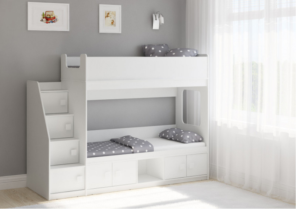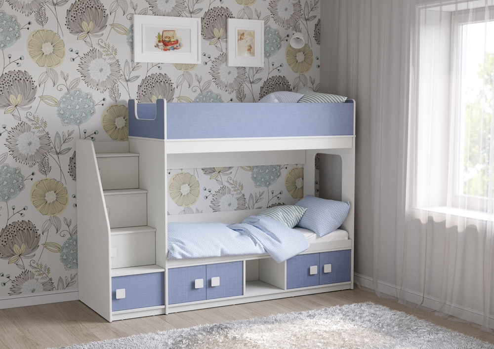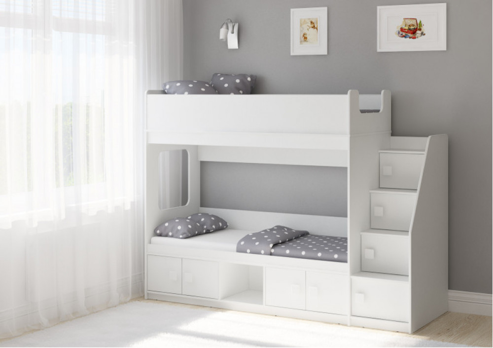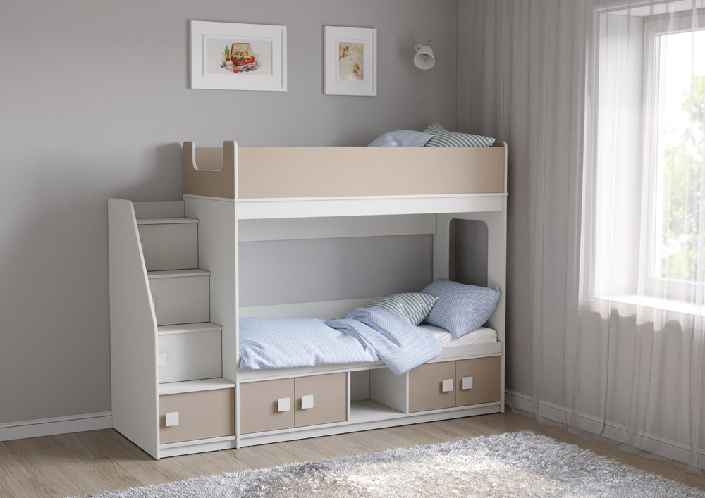 Классическая детская двухъярусная кровать с двумя параллельными спальными местами размером 1750х750 и 1900х750, закрытыми местами хранения и угловой лестницей-стеллажем.