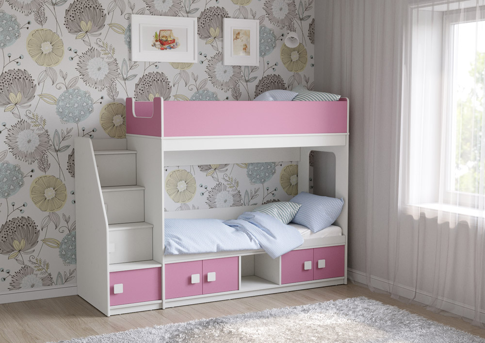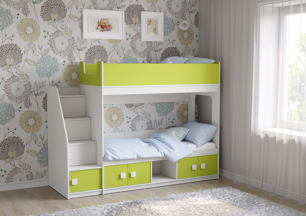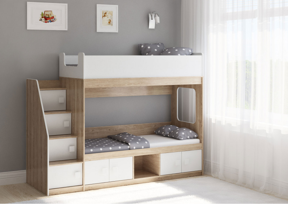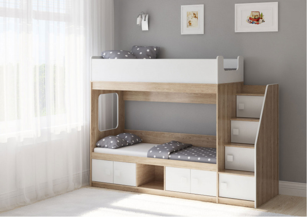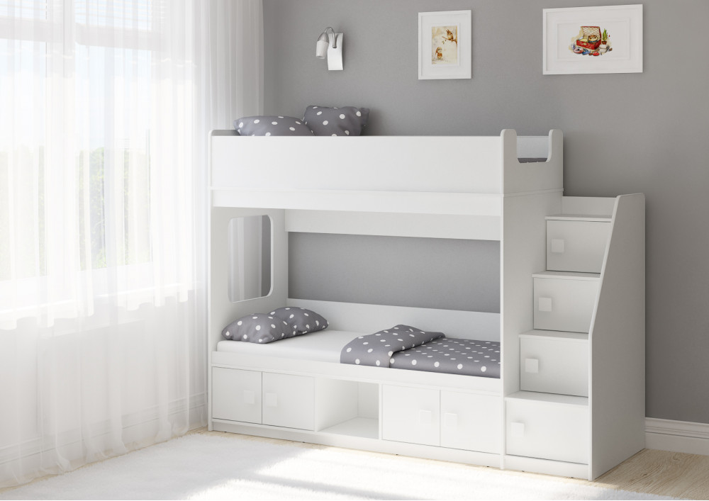 Классическая детская двухъярусная кровать с двумя параллельными спальными местами размером 1750х750 и 1900х750, закрытыми местами хранения и угловой лестницей-стеллажем.