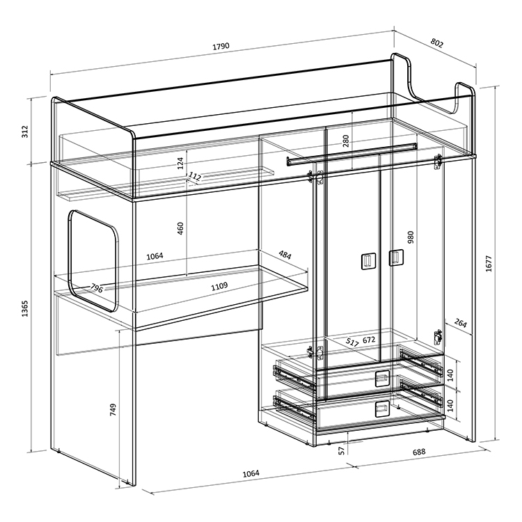 Высота кровати чердака всего 1677 мм.