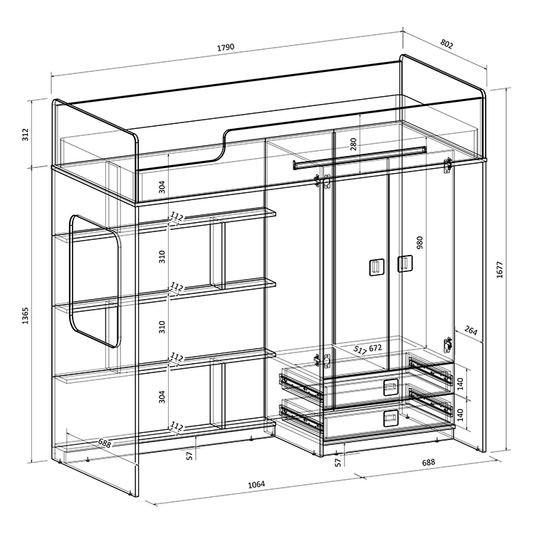 Высота кровати чердака всего 1677 мм.
