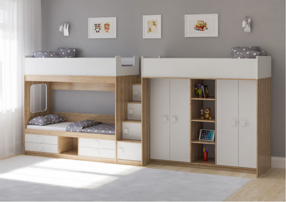 Две кровати, два шкафа, 4 выдвижных ящика – одна лестница.